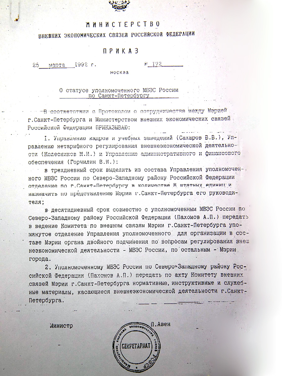 Другая причина, по мнению Шкруднева, в том, что депутатская группа Петросовета "обнаружила серьезные упущения". Через Пахомова это письмо, очевидно, попало к Авену, и вот тогда мэрия Санкт-Петербурга заключила "протокол о сотрудничестве" с МВЭС. А 25 марта Авен подписал удивительный приказ №172. Как сказано в приказе, Анатолий Пахомов должен был в десятидневный срок передать все дела Владимиру Путину, а КВС становился органом двойного подчинения с полномочиями, разумеется, Министерства внешнеэкономических связей по Северо-Западному региону. Вот так Путин сосредоточил в своих руках всю внешнеэкономическую деятельность в Санкт-Петербурге.