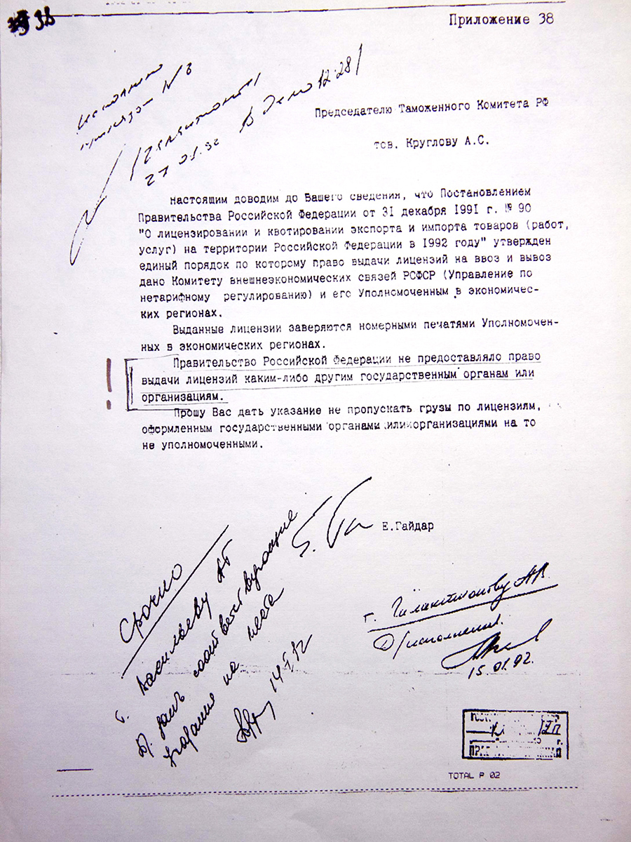 В январе председатель таможенного комитета Круглов А.С. получил от Гайдара послание, смысл которого был очевиден и вольной интерпретации не поддавался. "Настоящим доводим до вашего сведения, что Постановлением Правительства Российской Федерации от 31 декабря 1991 года № 90 "О лицензировании и квотировании экспорта и импорта товаров (работ, услуг) на территории Российской Федерации в 1992 году" утвержден единый порядок, по которому право выдачи лицензий на ввоз и вывоз дано Комитету внешнеэкономических связей РСФСР (Управление по нетарифному регулированию) и его Уполномоченным в экономических регионах. Выданные лицензии заверяются номерными печатями Уполномоченных в экономических регионах. Правительство Российской Федерации не предоставляло право выдачи лицензий каким-либо другим государственным органам или организациям. Прошу Вас дать указание не пропускать грузы по лицензиям, оформленным государственными органами или организациями на то не уполномоченными. Е. Гайдар".