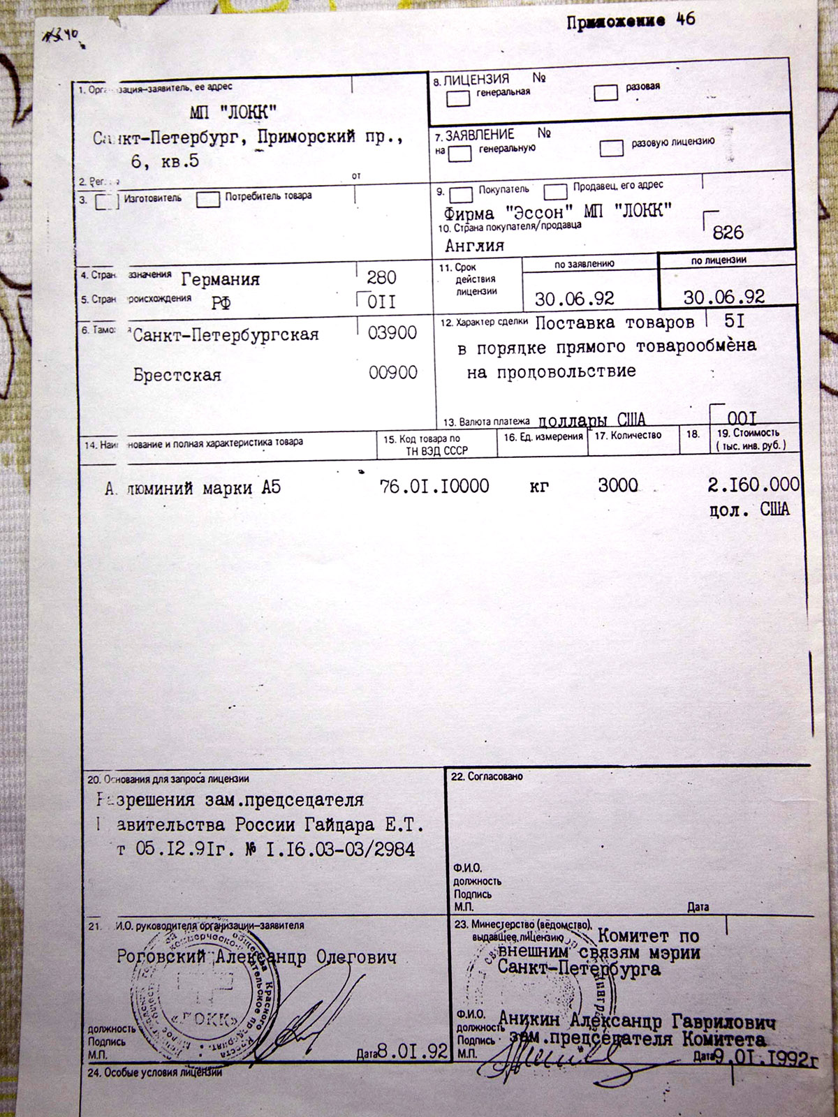 Малое предприятие "ЛОКК", по лицензии КВС должно было вывезти 3 тонны особо чистого алюминия в Англию. Предприятие "ЛОКК", которое официально занималось мелким рекламно-издательским бизнесом и было создано при Ленинградской организации Красного креста. Причем учредителем ЛОКК от имени этой организации, согласно базе данных регистрационной палаты Санкт-Петербурга, была указана ее председатель Татьяна Линева, которая сегодня возглавляет уже "Санкт-Петербургское отделени Красного Креста". Покупателем, как указано в лицензии, была компания "Эссон", никаких следов которой найти не удалось.