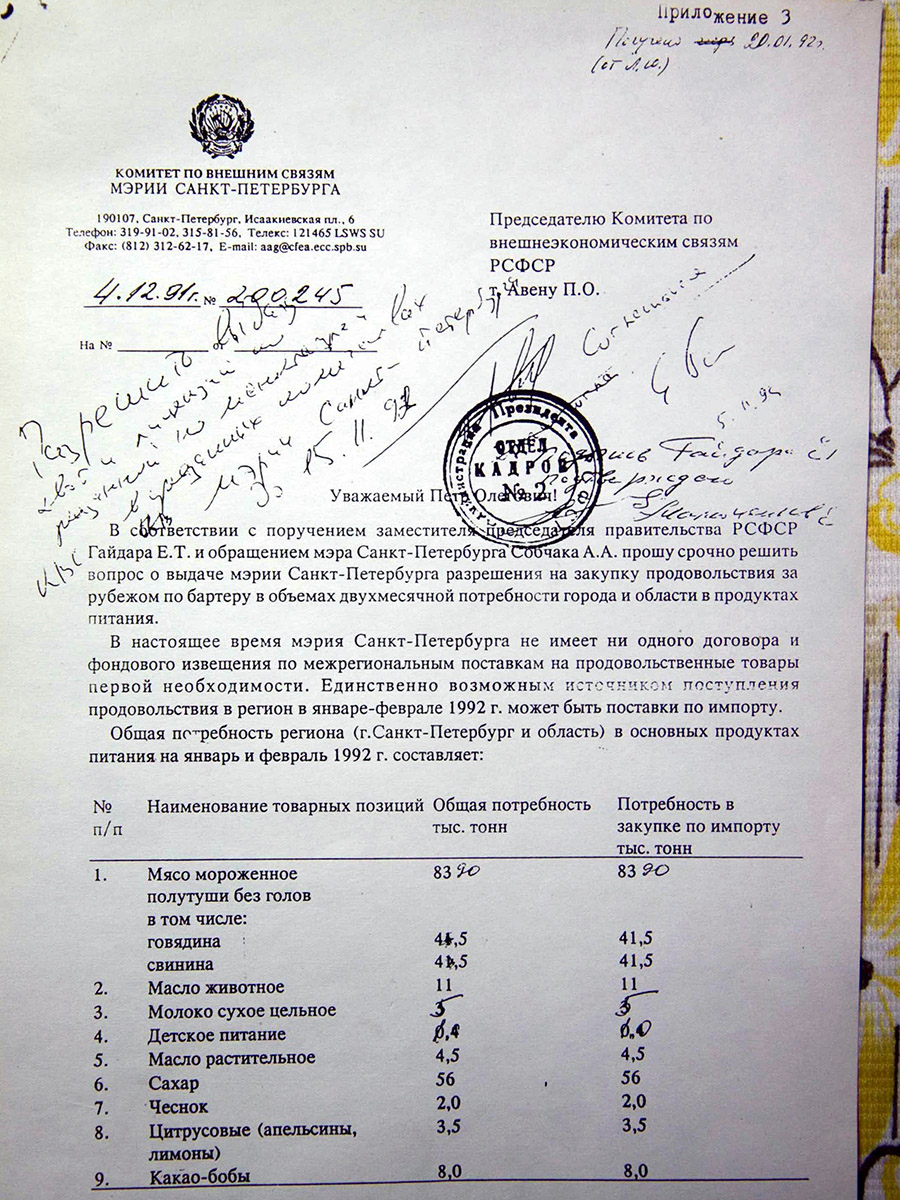 Чтение документов приводит к удивительному выводу – ссылки, даже в отчете комиссии Салье, на специальные правительственные решения по квотам для Петербурга не совсем оправданы. И не потому, что они неправильны. Просто двусмысленные резолюции Авена и Гайдара на письмах Путина и Собчака никак нельзя называть "правительственными решениями". Номера "решений", на которые ссылался Путин, а вслед за ним и все участники конфликта, являются номерами маленьких бумажек, которые общий отдел Управления делами Администрации Президента подшивал к письмам просителей. На бумажку перепечатывалась рукописная резолюция начальника, в данном случае Гайдара, ставилась печать общего отдела и номер с инициалами начальника. На лицензиях, которые выдавал Путин, указывались именно эти номера.