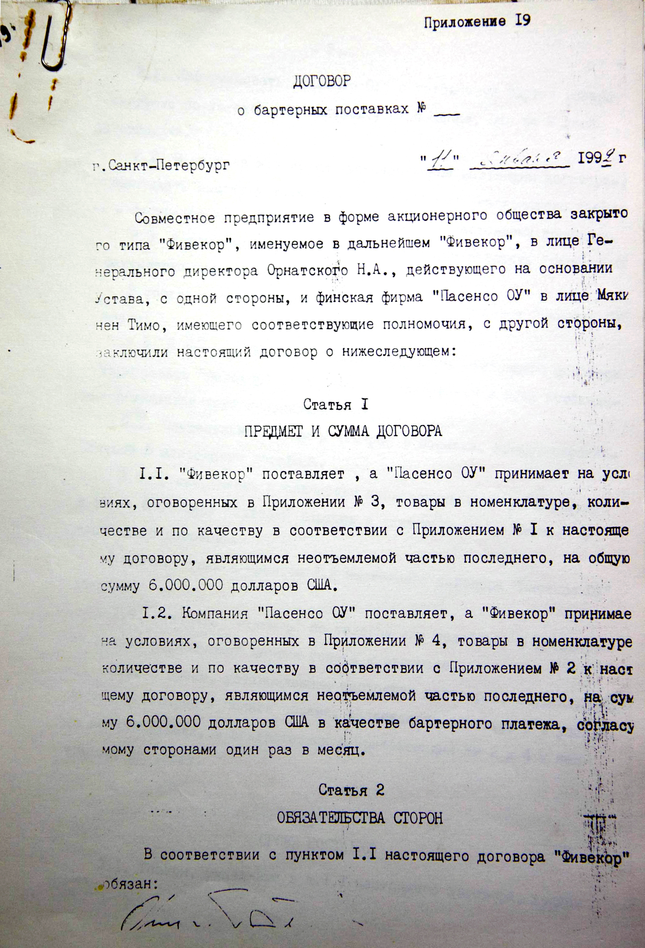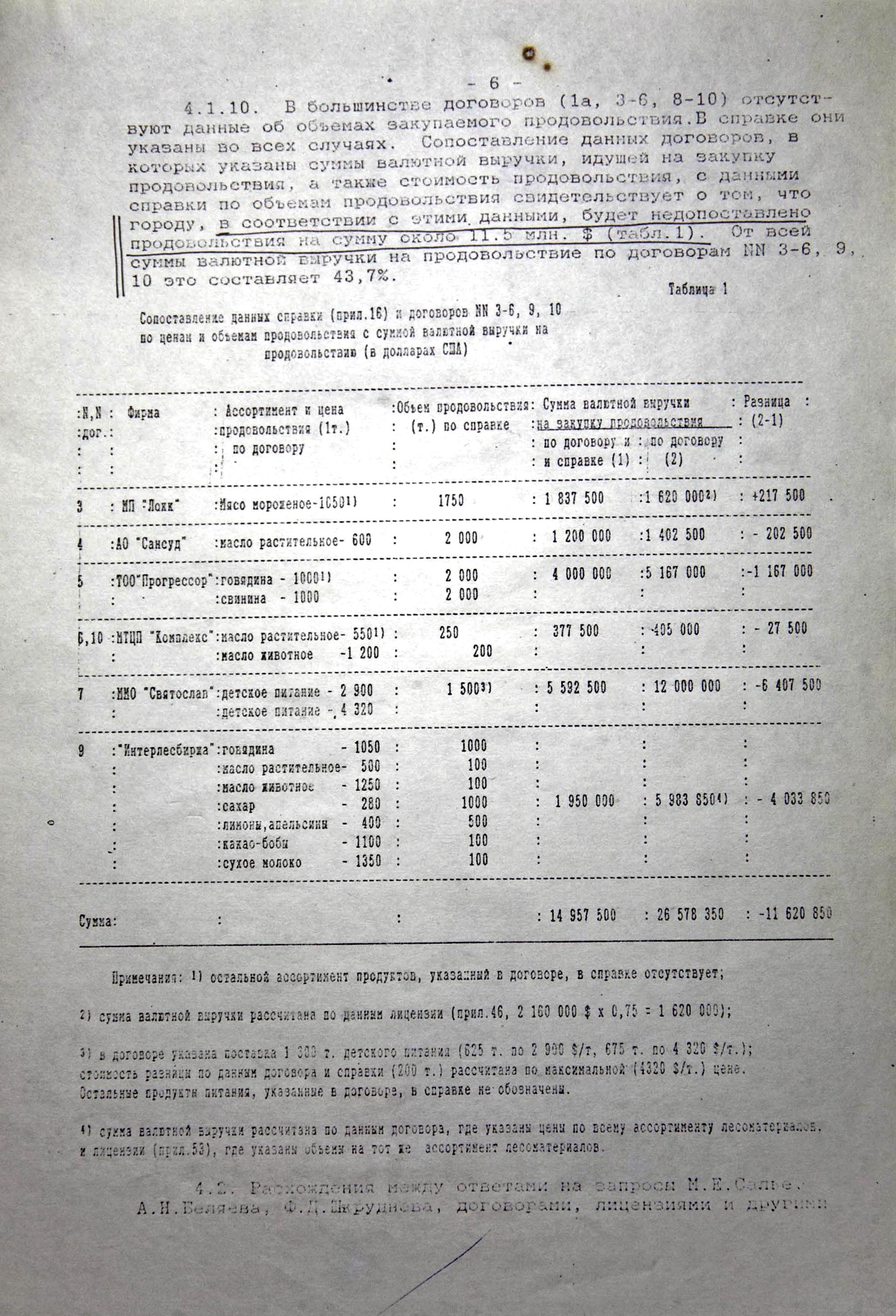 Сравнение данных из реальных договоров с теми, что представил Путин в Петросовете, показывает довольно серьезные расхождения. Как подсчитала комиссия Салье, только на ценовой разнице по продуктам питания город должен был потерять 11,5 миллионов долларов. В некоторых договорах даже не упомянуты санкции за "непоставку", или они составляют ничтожные суммы. Например - 2%, и даже не указано в какой валюте – в рублях или в долларах. А комиссионные фирм-посредников доходили до 50%. Хотя это были "бартерные сделки". Только непонятно, кого с кем. Лишь одна компания, "Фивекор", представила КВС свои бартерные контракты с двумя финскими предприятиями.