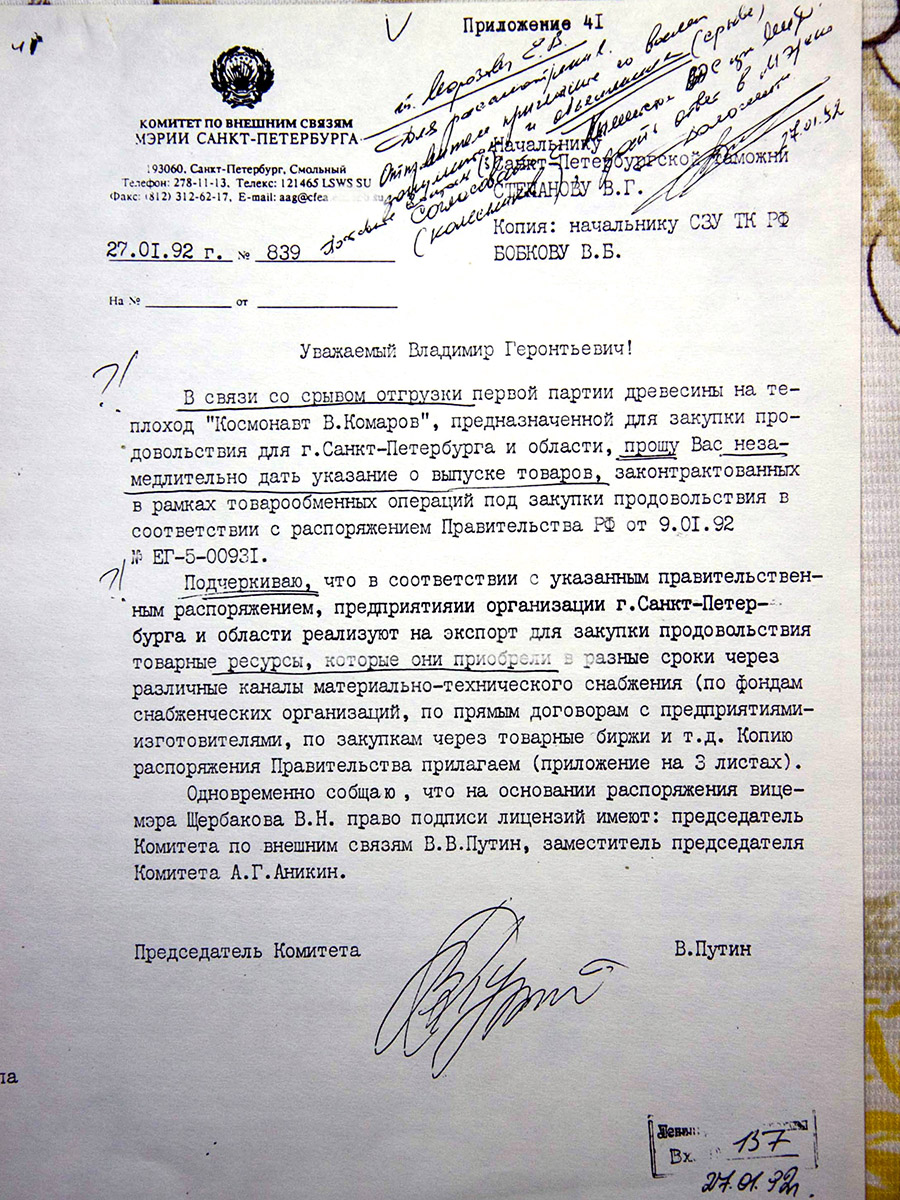Письмо довольно хитрое. Собчак, избегая скользкой темы, не просит прямо подтвердить существование "решения правительства" на выдачу лицензий. Он просит освободить "предприятия" от обязательной продажи части валютной выручки, а так же продлить сроки действия выданных лицензий. И все это в продолжение уже как бы реально существующего "решения Правительства". На письме Собчака, адресованном Гайдару, нет ни одной резолюции самого Гайдара. Но почему-то стоят две резолюции все того же Авена. Почерк его ужасен, но на подшитом "квитке" общего отдела Управления делами Президента все расшифровано: "Поддерживаю без изменения квот и экспортных пошлин" (подпись Авена). "По экспортным пошлинам согласен по договорам, заключенным между мэрией Санкт-Петербурга и поставщиками до 15.01.92 г. В.В.Путину под личную ответственность" (подпись Авена).