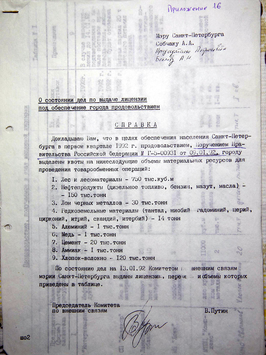 13 января 1992 года Путин получил запрос из Петросовета с требованием "представить исчерпывающую информацию и полный комплект соответствующих документов", касавшихся выдачи лицензий. Он должен был это сделать на следующий день, 14 января, на специальном закрытом заседании в Петросовете. На заседание Путин не принес ничего, кроме небольшой справки, уместившейся на двух листках бумаги.