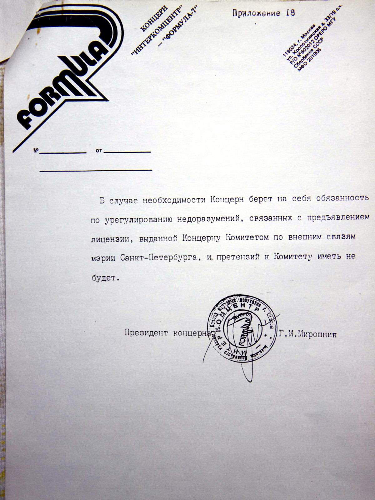 Интересна и расписка от главы фирмы "Интеркомцентр" Григория Мирошника, в которой указывается, что фирма не будет предъявлять претензии КВС мэрии Санкт-Петербурга в случае возникновения недоразумений, связанных с предъявлением выданной им лицензии, и самостоятельно урегулирует их.