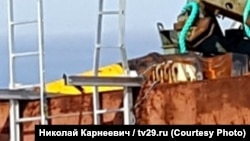Левее упавшего крана видна металлическая конструкция с V-образным ложементом. Радио Свобода предполагает, что это кантователь – механическое устройство, предназначенное для фиксации объектов и их поворота под различными углами, своего рода большие тиски. Форма кантователя намекает на то, что он предназначен для работы с цилиндрическими объектами. Дает ли он возможность поворачивать объект или просто служит подставкой, по снимку понять сложно.