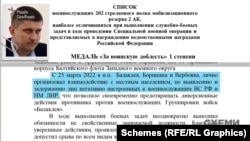 Журналисты "Схем" дозвонились жене Пашкеева. Она подтвердила, что он был награжден медалью "За воинскую доблесть" и даже оформил соответствующую надбавку к зарплате.